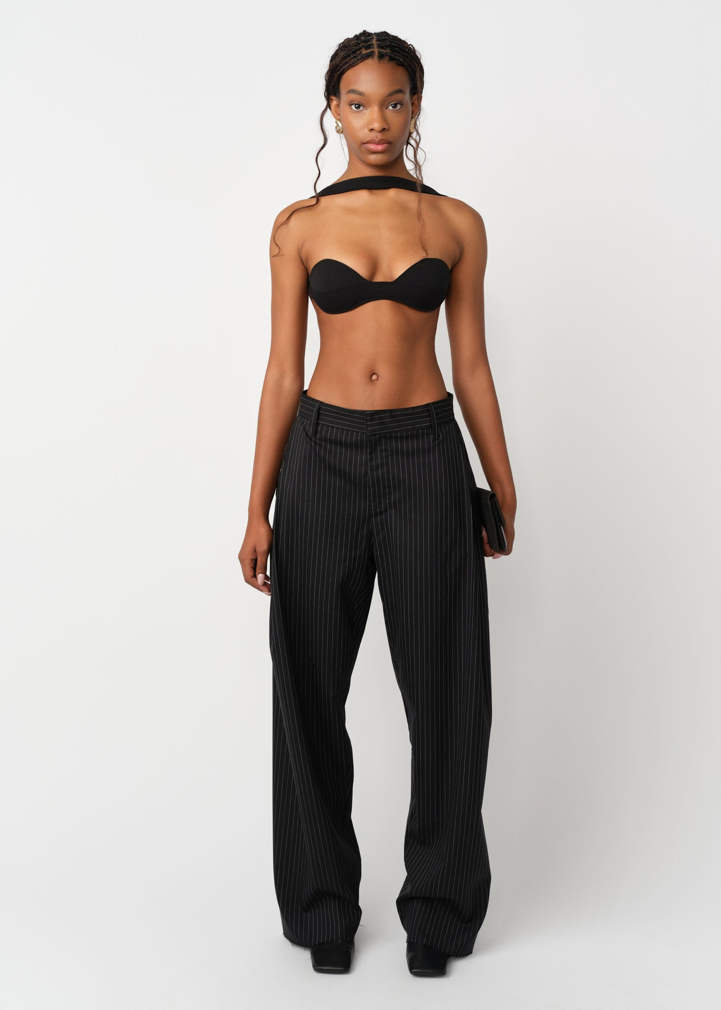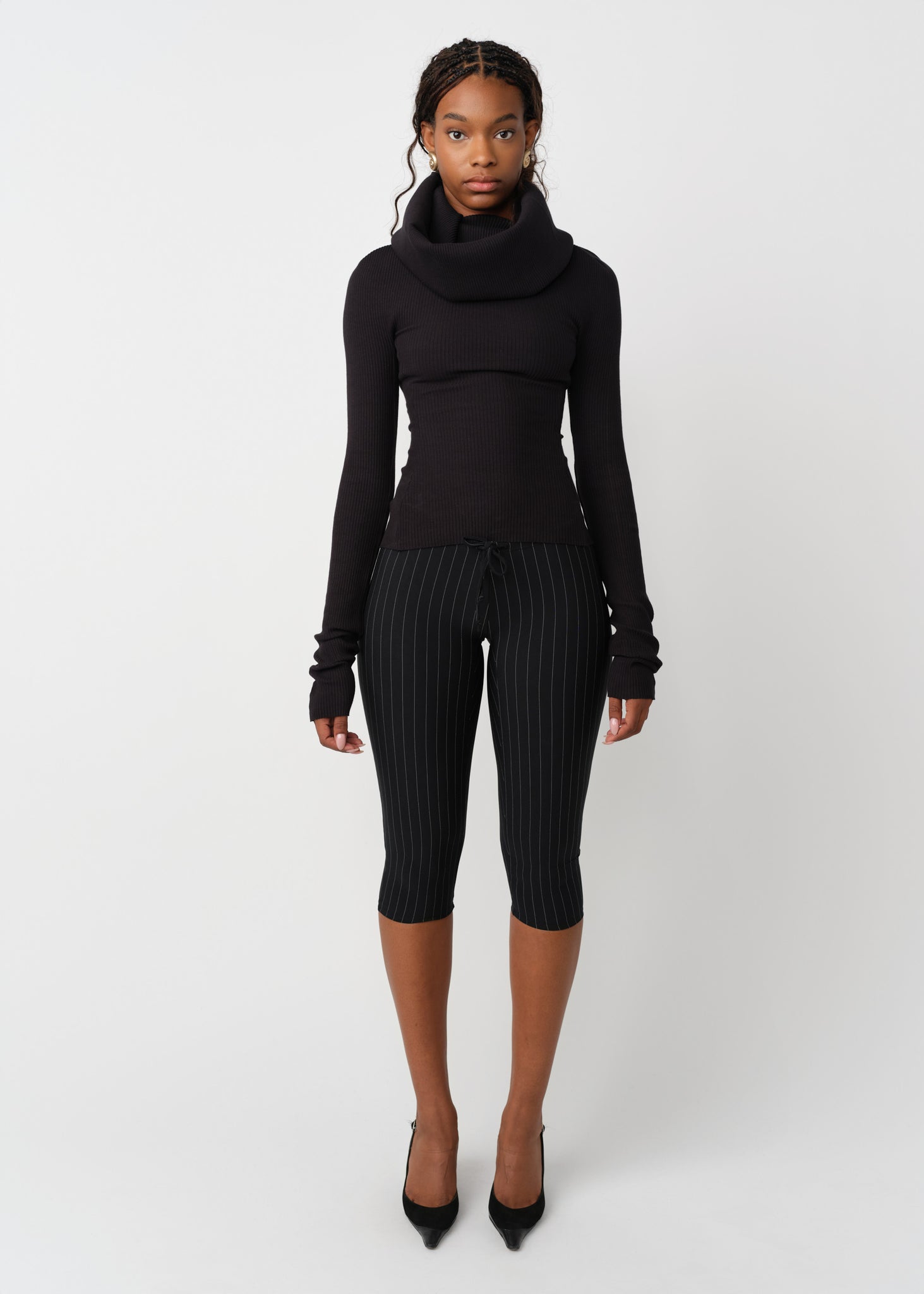 Woman wearing a black top with puff sleeves and white pants on a white background